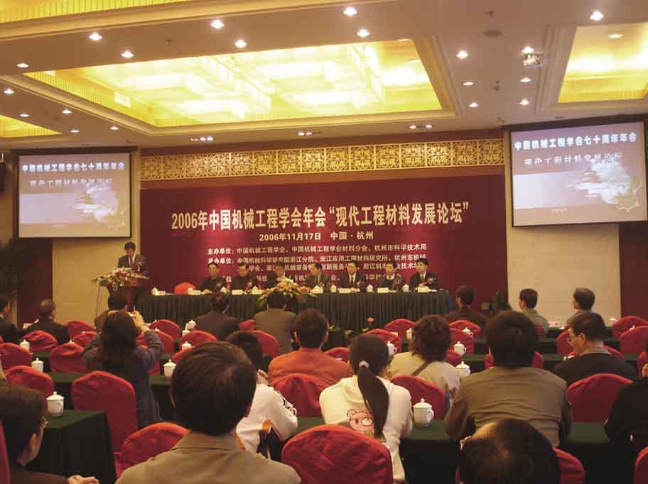 11月17日,2006年中國機械工程學會年會“現(xiàn)代工程材料發(fā)展論壇”在杭州新僑飯店隆重召開。本次會議由中國機械工程學會、中國機械工程學會材料分會、杭州市科技局主辦,中國機械科學研究院浙江分院、浙江應(yīng)用工程材料研究所、杭州市機械工程學會、浙江省機械裝備制造創(chuàng)新服務(wù)平臺、浙江機電職業(yè)技術(shù)學院承辦,浙江省科技廳、浙江省機械工程學會、杭州市科學技術(shù)協(xié)會協(xié)辦。中國工程院院士鐘群鵬、中國機械工程學會副秘書長王瑞剛、中國機械科學研究總院院長李新亞、杭州市人民政府副秘書長趙立康、杭州市科學技術(shù)協(xié)會主席朱國海、杭州市科學技術(shù)協(xié)會副主席何西華、杭州市科技局副局長周軍等領(lǐng)導(dǎo)出席了本次會議,會議由中國機械科學研究總院副院長王德成主持,來自在杭機械行業(yè)企業(yè)及學術(shù)界代表共100余人參加了此次會議。